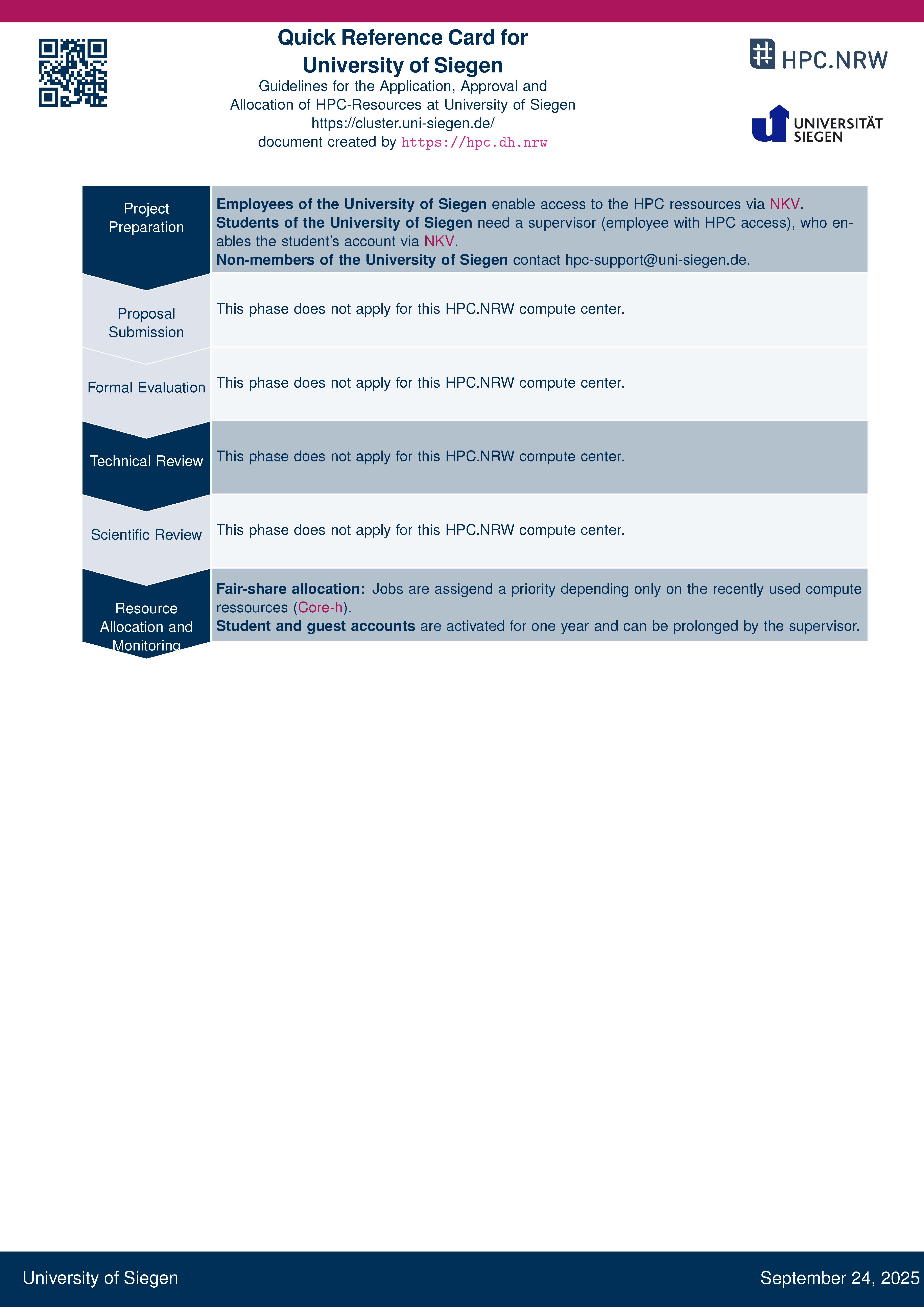 klein | bis ca. 1 Mio. CPU-Core-h | lokale Versorgung, Kleinprojekte | NHR Starter-Projekte, NHR-Testprojekte | - |