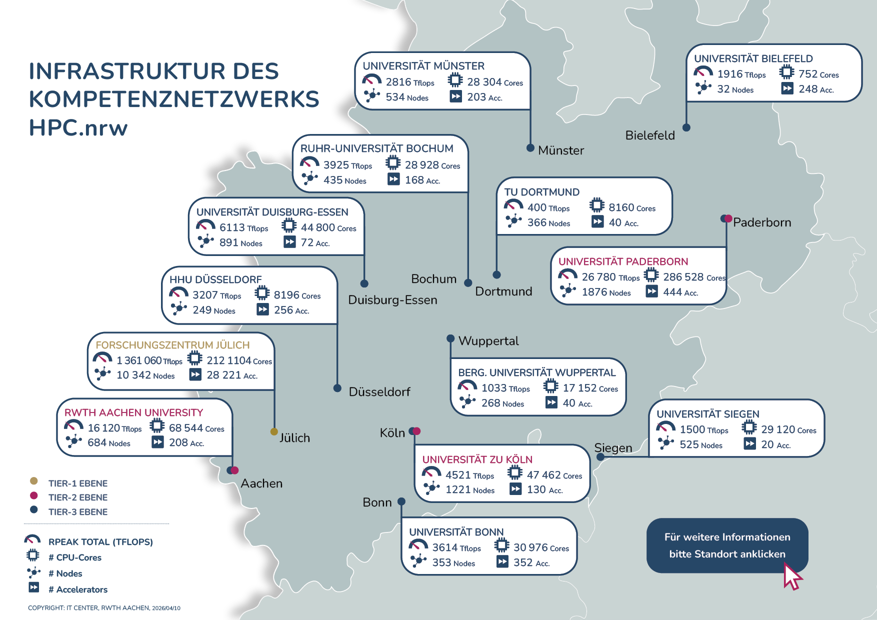 Das Land Nordrhein-Westfalen verfügt über ein ausdifferenziertes Ökosystem von Hochleistungsrechenanlagen der Ebenen 0 und 1 der HPC-Versorgungspyramide (Forschungszentrum Jülich), über Anlagen der Ebene 2 (Aachen, Köln, Paderborn) bis zu Hochleistungsrechnern der Ebene 3 an fast allen Universitätsstandorten. Die Arbeitsgruppe HPC der Digitalen Hochschule NRW (DH.NRW) hat vor diesem Hintergrund ein HPC-Landeskonzept entwickelt mit dem Ziel, das HPC-Ökosystem in Nordrhein-Westfalen innerhalb des nationalen HPC-Kontexts weiter zu entwickeln.